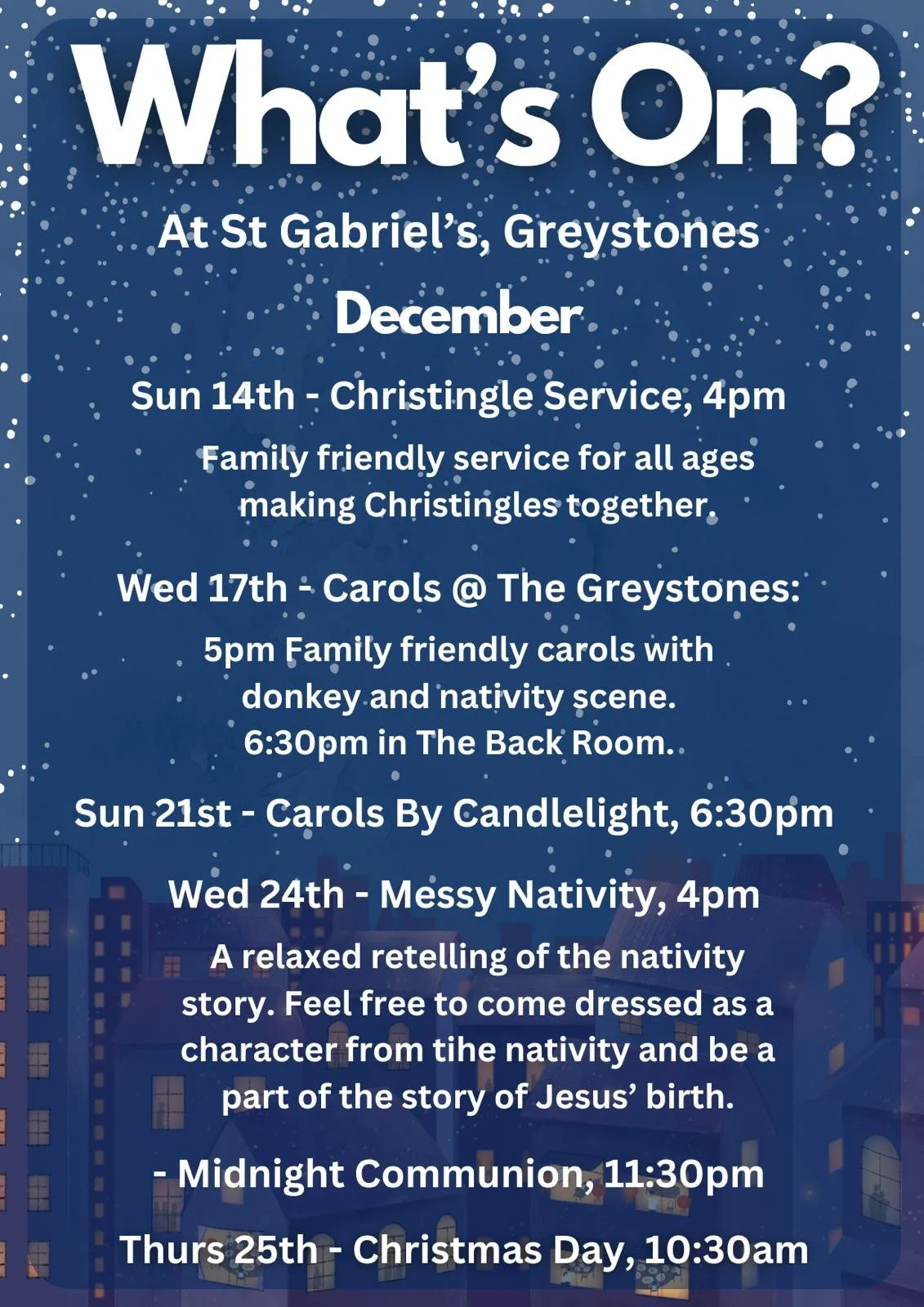 Join us at The Greystones Pub on Wednesday, 17th December for a festive evening of Christmas cheer! At 5pm, enjoy carols and a live Nativity scene where you will have the opportunity to get your photo taken with Mary, Joseph and JoJo the donkey, bringing the story of Christ’s birth to life for all ages. Then at 6pm, stay for sing-along carols and a short talk from Bishop Leah where everyone can join in the fun and festive spirit. It’s a wonderful way to celebrate the season with family, friends, and the local community.